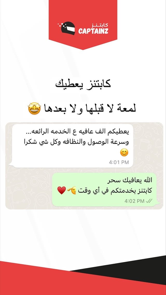 "غسيل متنقل مريح وسهل الحجز. جربت أكثر من شركة، وكابتنز فعلاً الأفضل في السعر والجودة 💯"